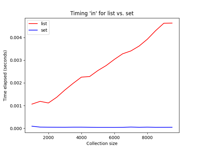 Several classes ago, we plotted the execution time of membership queries of list and sets of different sizes. Recall that we observed that the query time grew linearly with the size of list, but did not grow at all as we increased the size of the set: