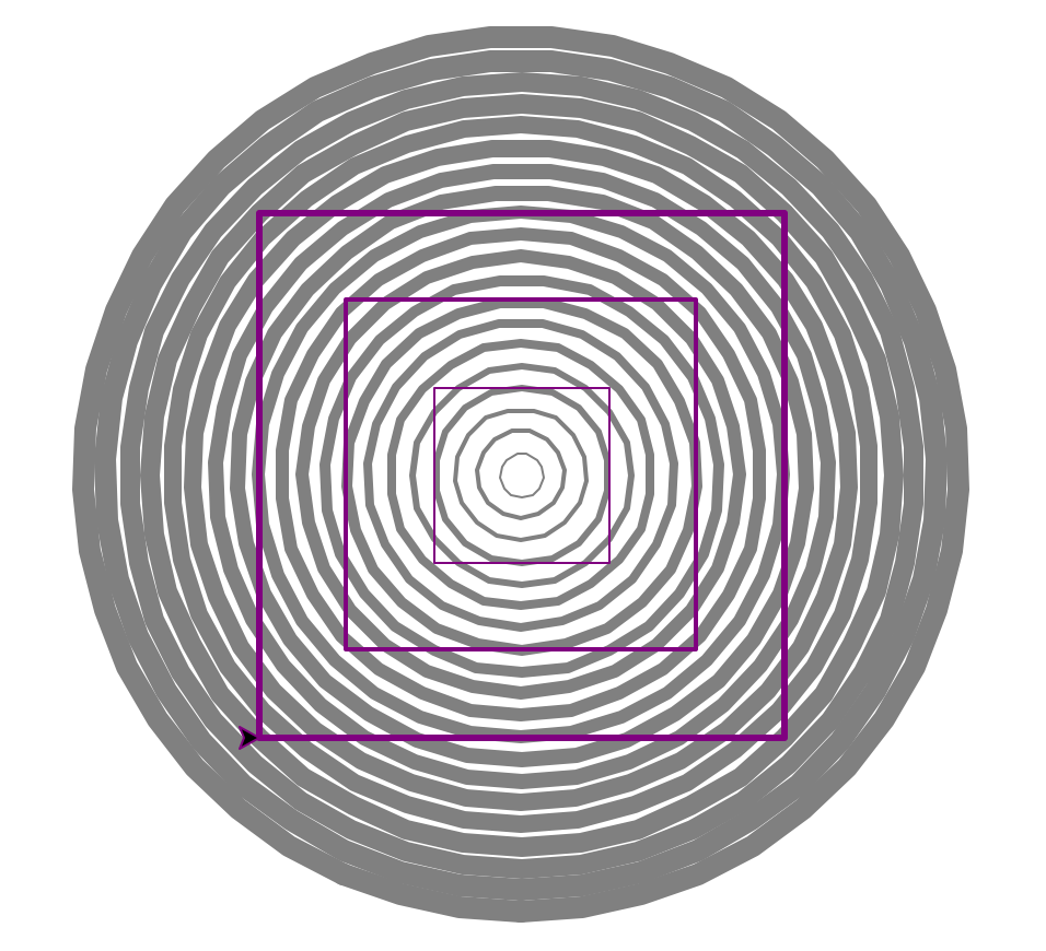 function you wrote previously. Think about how you can use the loop variable to determine the pen size, the position and the side length, i.e., can you define expressions for each those quantities in terms of your loop variable. For example, if your loop variable is the square size