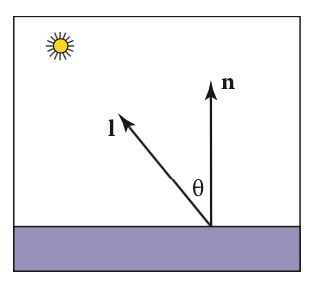 Matte-like materials diffuse the incoming light in all directions across their surfaces. The intensity of the diffusion can be modeled using Lambert's law which states that the diffused light intensity is proportional to how much the normal vector of a surface aligns with the direction to the light source. This can be quantified by looking at the cosine of the angle between the light direction and the normal vector or, equivalently, the dot product between the aforementioned vectors. We then have
