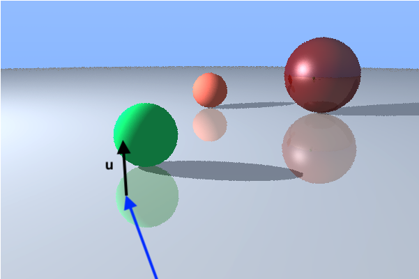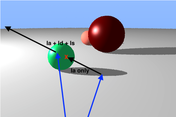 In the image above, the primary camera rays are drawn in blue and the secondary rays to the light source (at the top left of the scene) are drawn in black.