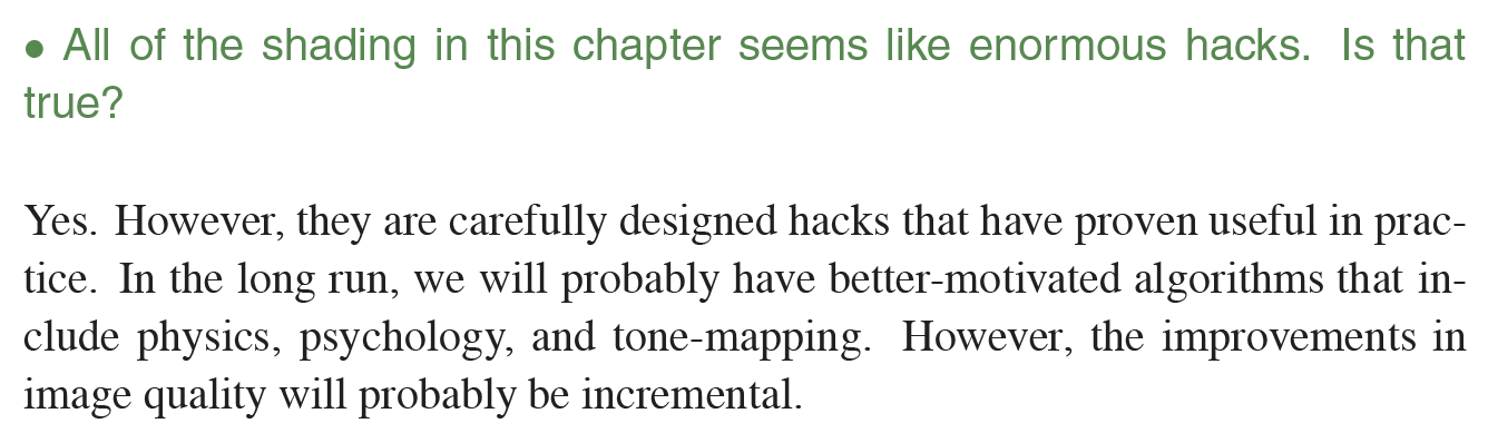 Warning: We'll quantify and reason through how some of the equations we use relate to reality, but shading might sound like a bunch of hacks. All we care about is making our objects look a certain way, which will involve tuning a lot of the parameters in our equations. Here's an excerpt from the FAQ section of Fundamentals of Computer Graphics: