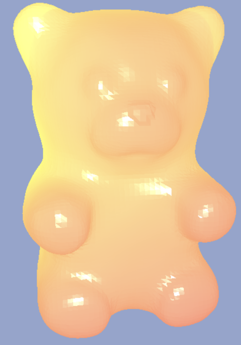 When you open (and render) the initial template, the gummy bear (obtained here) will render using the Phong reflection model. There is a backlight with position xb and color cb which will contribute color through the gummy bear. Your task is to calculate the subsurface scattering component cphong).